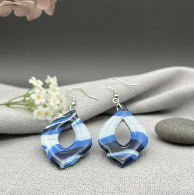 Boucles d’oreilles Melodie aux douces couleurs de différents bleus et de blanc, en pâte polymère recouvert de résine UV des 2 côtés, non réversibles, fait main en unique exemplaire.
