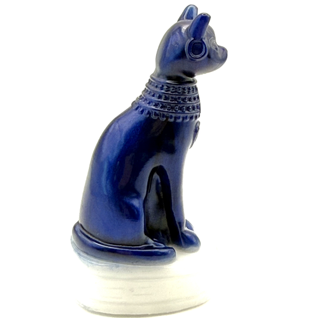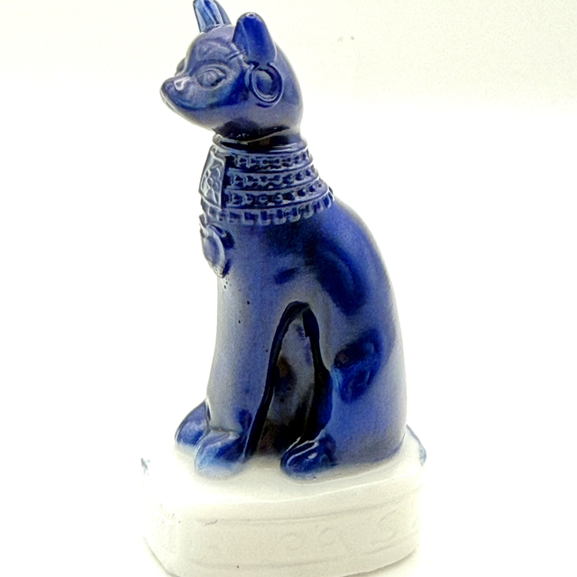 Joli chat Égyptien bleu saphir sur socle blanc avec incrustation Égypte et hiéroglyphes, en résine époxy, fait main, unique exemplaire.