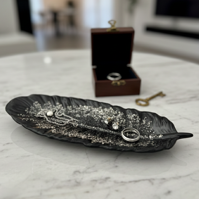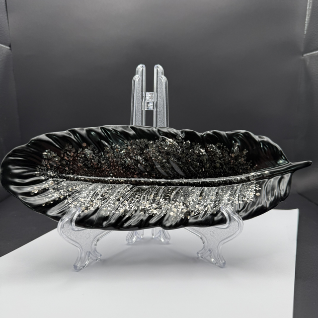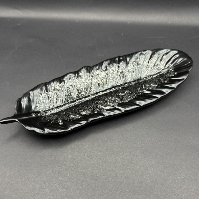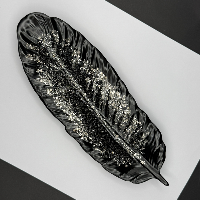 Inspirée par la finesse d'une plume ou d'une feuille exotique, cette pièce arbore un noir profond et brillant. L'intérieur est somptueusement incrusté de paillettes scintillantes de différentes tailles (noir et argent) qui captent la lumière, créant un effet de veinage spectaculaire. Son fini glacé ultra-brillant lui confère une allure résolument moderne et chic.