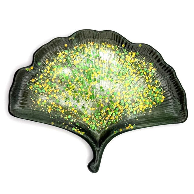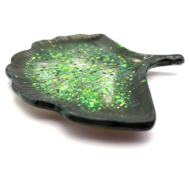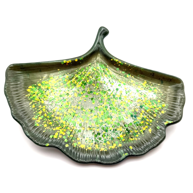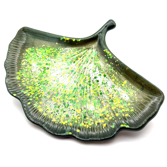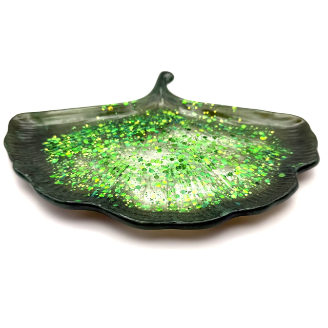 Joli petit vide poche en forme de feuille ginkgo avec paillettes vertes et jeu de transparence, en résine epoxy, fait main en unique exemplaire.