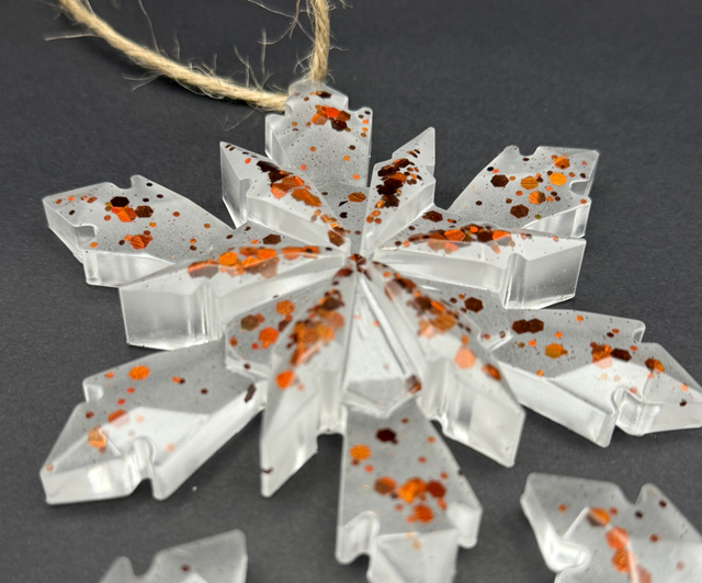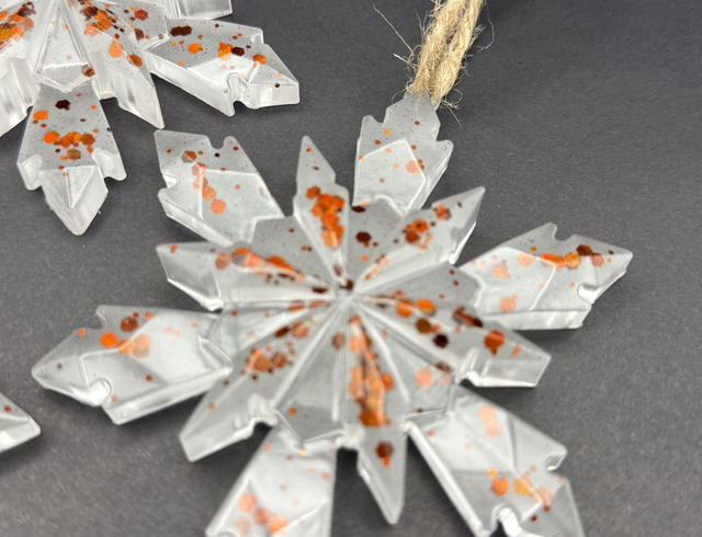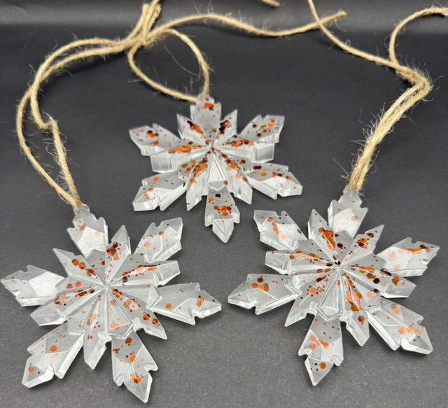 Lot de 3 suspensions de Noël en forme d’étoiles semi translucides avec paillettes marron, phosphorescents dans le noir, en résine époxy, fait main, unique exemplaire.