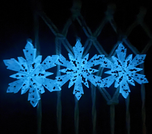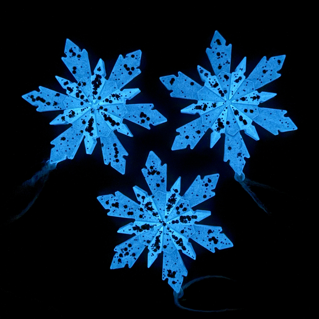 Pour une déco de fêtes de fin d’année qui sort du commun avec ce côté lumineux surprenant. Qu’elles soient suspendues dans le sapin, disposées sur une fenêtre ou une porte, elles ne passeront pas inaperçues. (Attention je n’affirme pas que le côté phosphorescent le soit très longtemps et ne peut que l’être que si exposée en plein jour durant un certain laps de temps). La photo de nuit ayant été prise avec un appareil photo le côté lumineux est beaucoup plus appuyé.