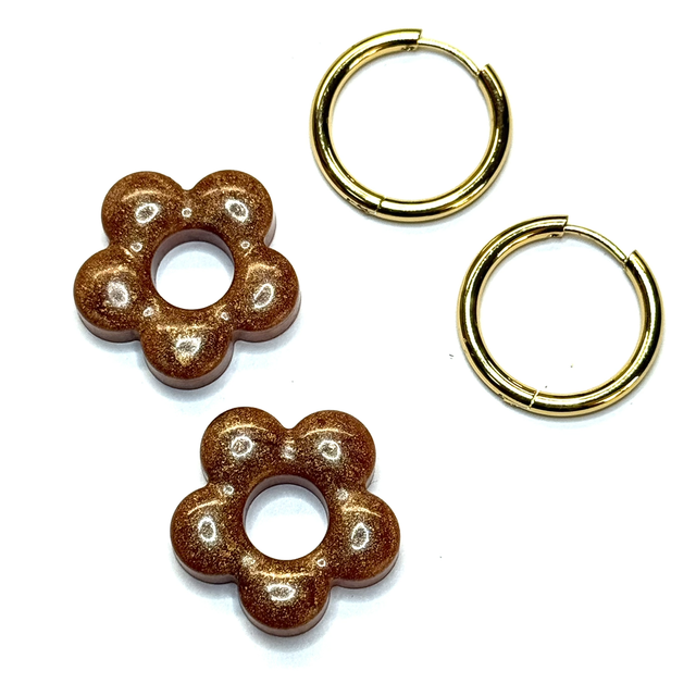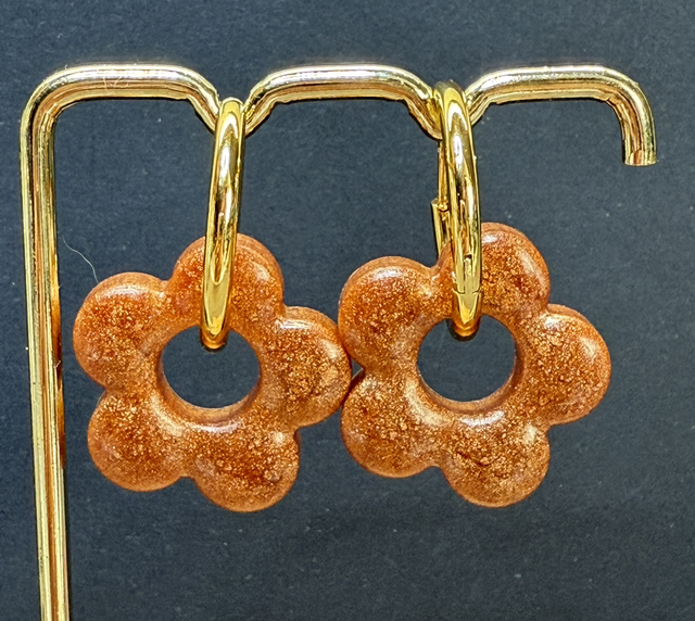 Jolies paire de pampilles moyennes fleurs de couleur mordoré, à marier avec une paire de créoles argentées ou dorées, en résine époxy, fait main, unique exemplaire.
