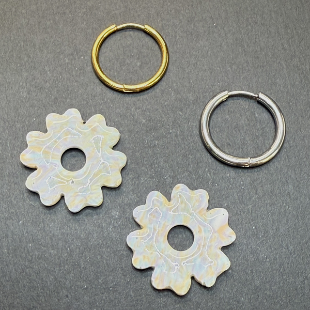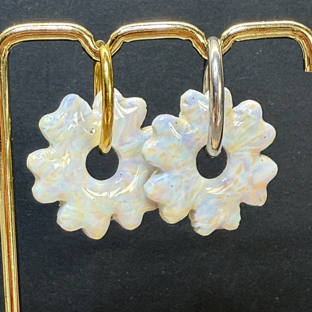 Pampilles Florale aux douces couleurs du sucre d’orge de notre enfance, mauve, jaune pale, bleu pâle et quelques pointes de paillettes argentées, en pâte polymère recouvert de résine UV des 2 côtés, non réversibles, fait main en unique exemplaire.