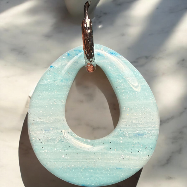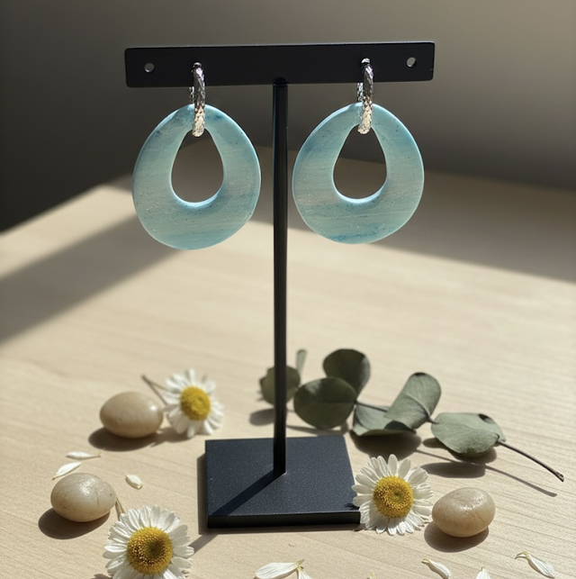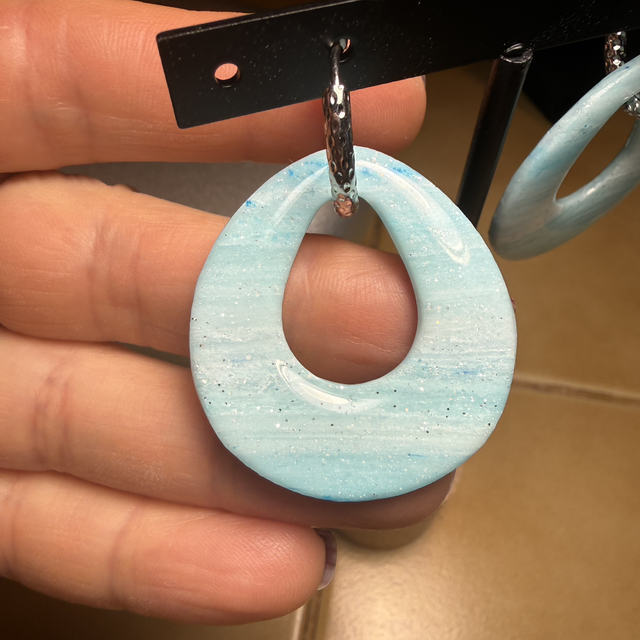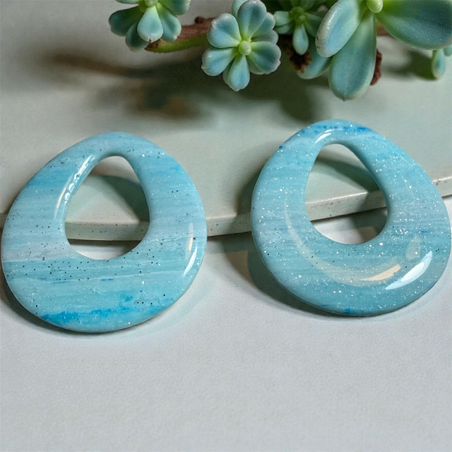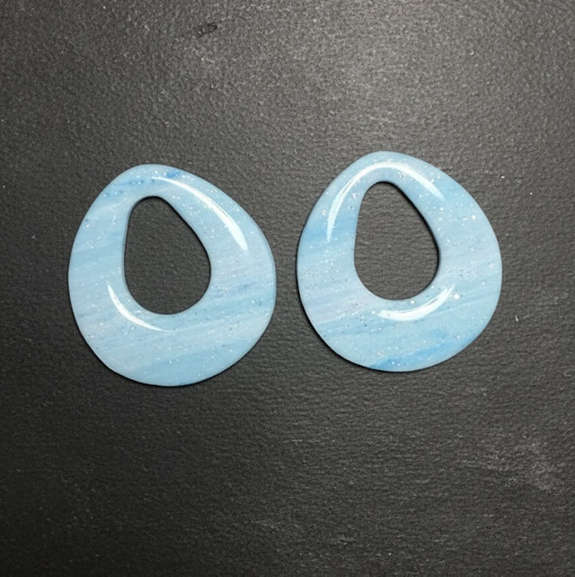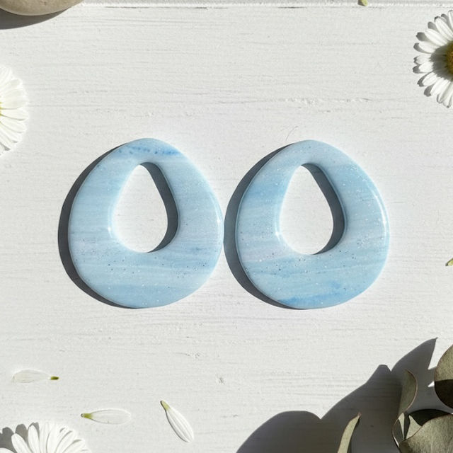 Ces élégantes pampilles en pâte polymère sont façonnées à la main dans une forme contemporaine de goutte ouverte. Leur motif captivant évoque un ciel d'hiver azur ou une mer légèrement agitée, grâce à un magnifique mélange de bleu clair marbré et de fines paillettes blanches scintillantes qui rappellent la neige ou les étoiles lointaines.