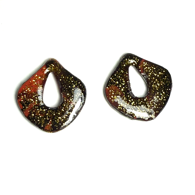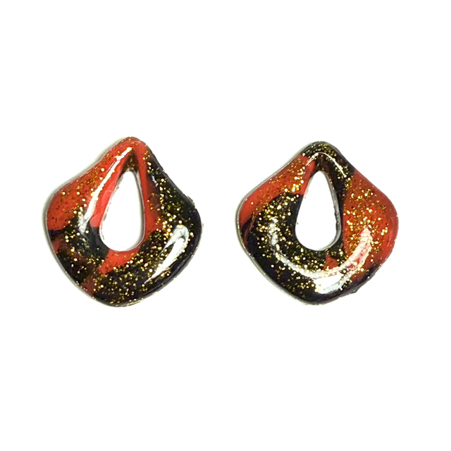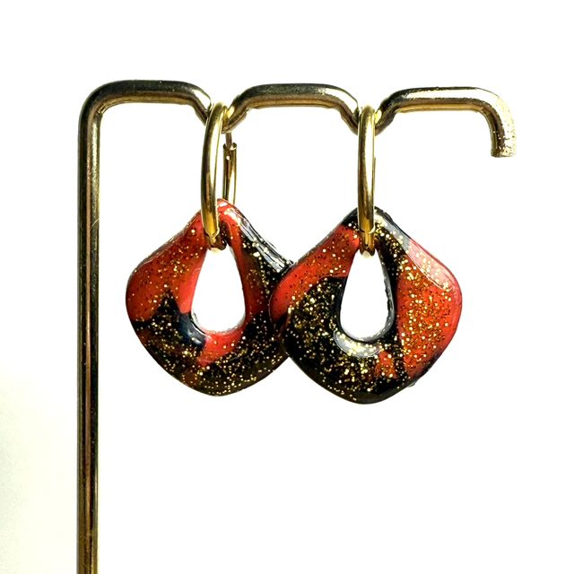Pampilles Laura en rouge et noir avec micro paillettes dorées, en pâte polymère recouvert de résine UV des 2 côtés, non réversibles, fait main en unique exemplaire.