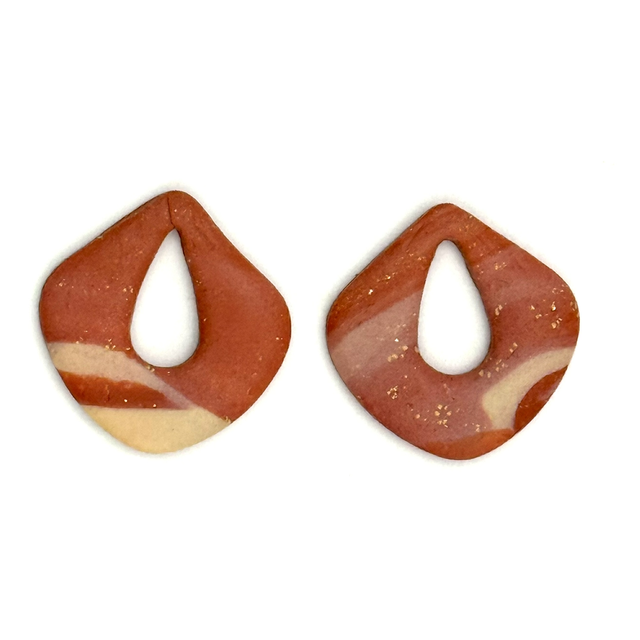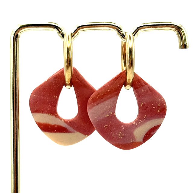 Pampilles Laura couleur terre d’argile, avec éclats de feuilles dorées, en pâte polymère recouvert de vernis mat satiné des 2 côtés, non réversibles, fait main en unique exemplaire.