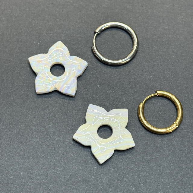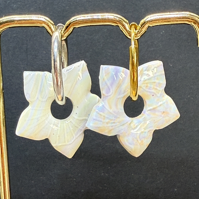 Jolie paire de pampilles Olivia aux douces couleurs du sucre d’Orge, petit rappel de notre enfance, avec effet feuille de ginkgo, en pâte polymère recouverte avec de la résine UV des 2 côtés, fait main, unique exemplaire.