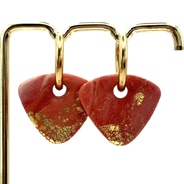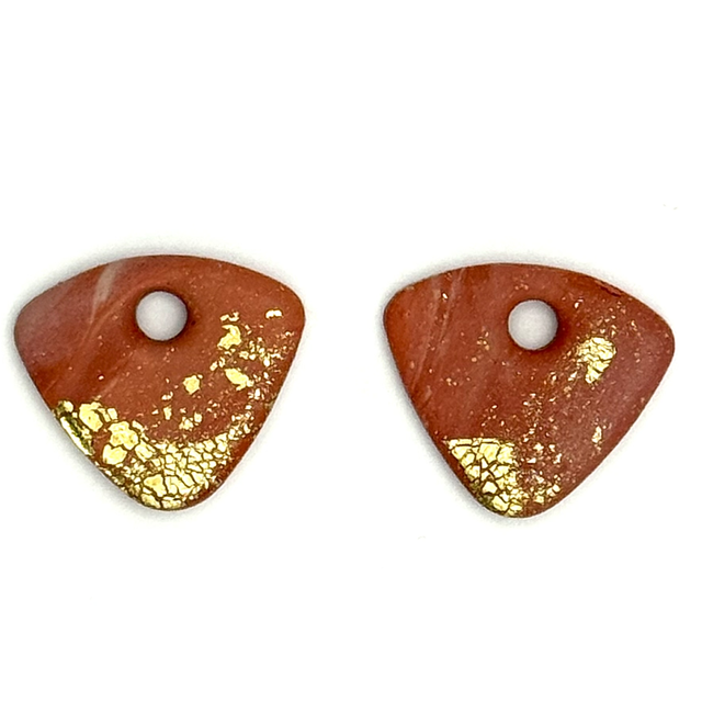 Pampilles Tricia couleur terre d’argile avec feuille d’or, en pâte polymère recouvertes des 2 côtés avec un vernis mat satiné, réversibles, fait main en unique exemplaire.