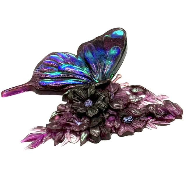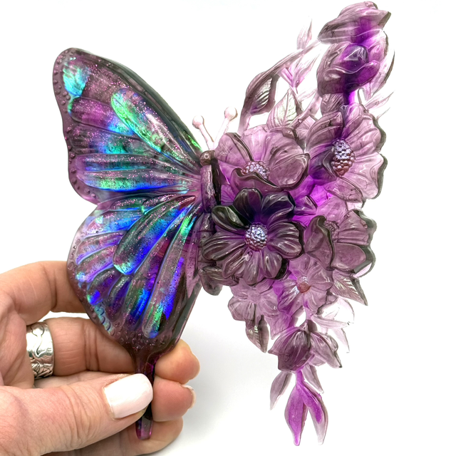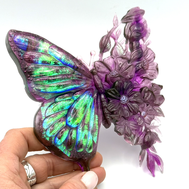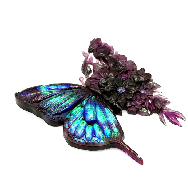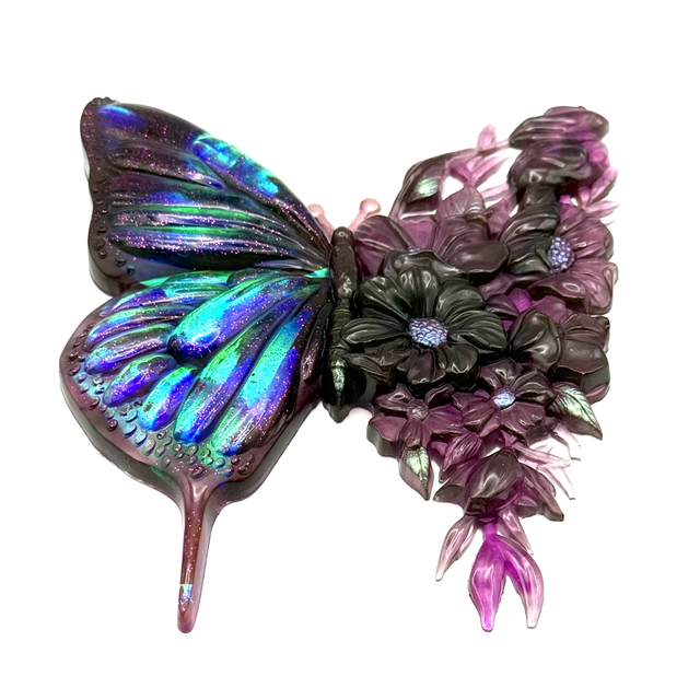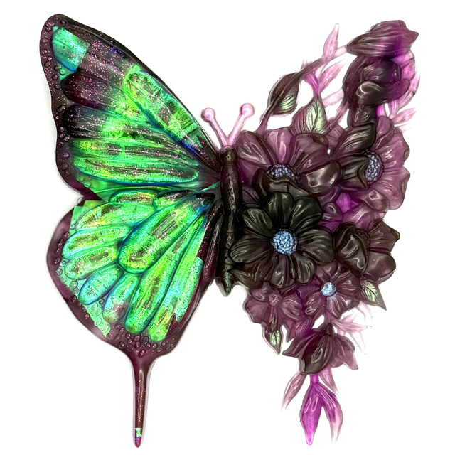 Design Bi-matière : Un côté à l'effet holographique captant la lumière avec des reflets changeants et de délicates paillettes roses, tandis que l'autre aile révèle un magnifique travail floral tout en transparence.