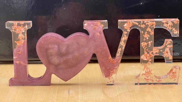 Bibelot LOVE dans les tons roses et transparence avec feuilles d’or, en résine époxy, fait main en unique exemplaire.