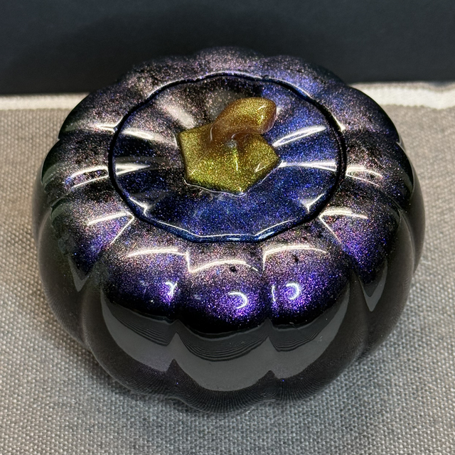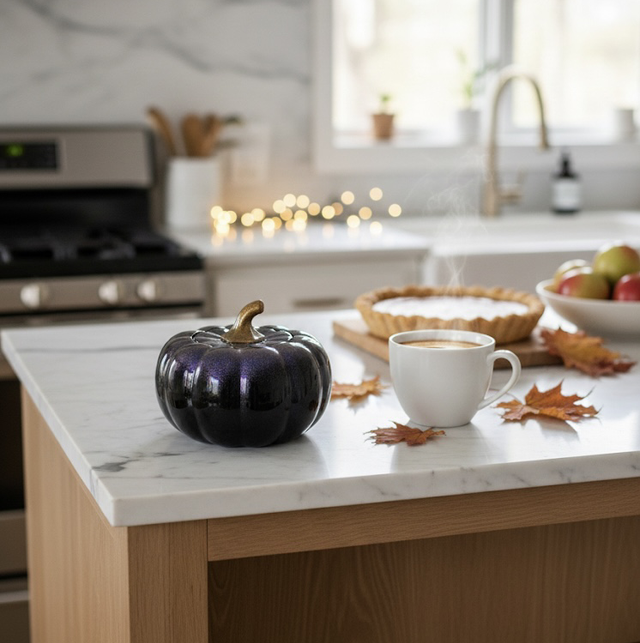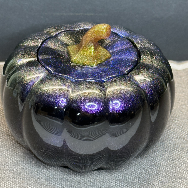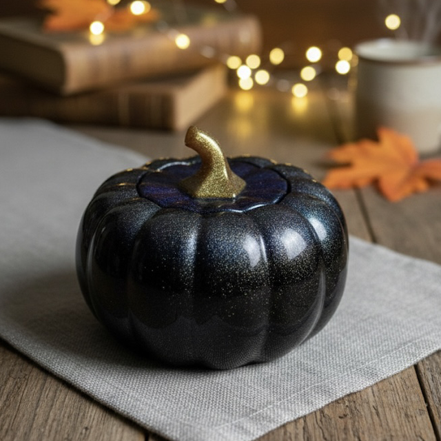Sa couleur profonde et irisée évoque un ciel nocturne d'automne. Le corps de la citrouille présente un noir intense qui se transforme en reflets chatoyants de bleu saphir et de violet cosmique grâce à des pigments spéciaux qui scintillent à la lumière. La tige, délicatement travaillée dans un coloris bronze-doré, apporte une touche de contraste chaleureux.