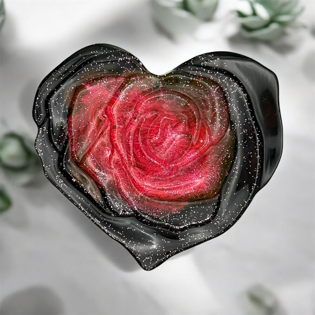 Boîte Cœur Rose dans les tons noirs avec sur le couvercle des nuances de roses dans la rose et fines paillettes rosées, en résine époxy, fait main, unique exemplaire.