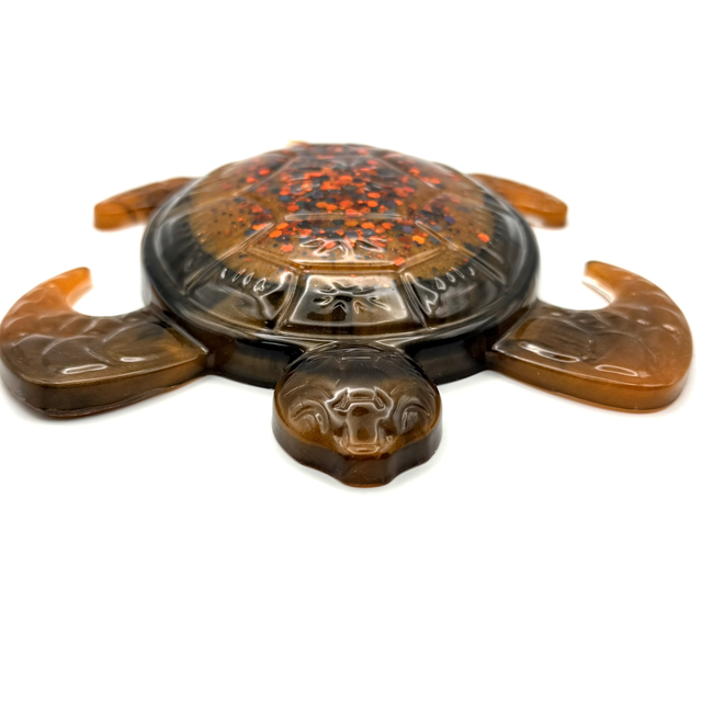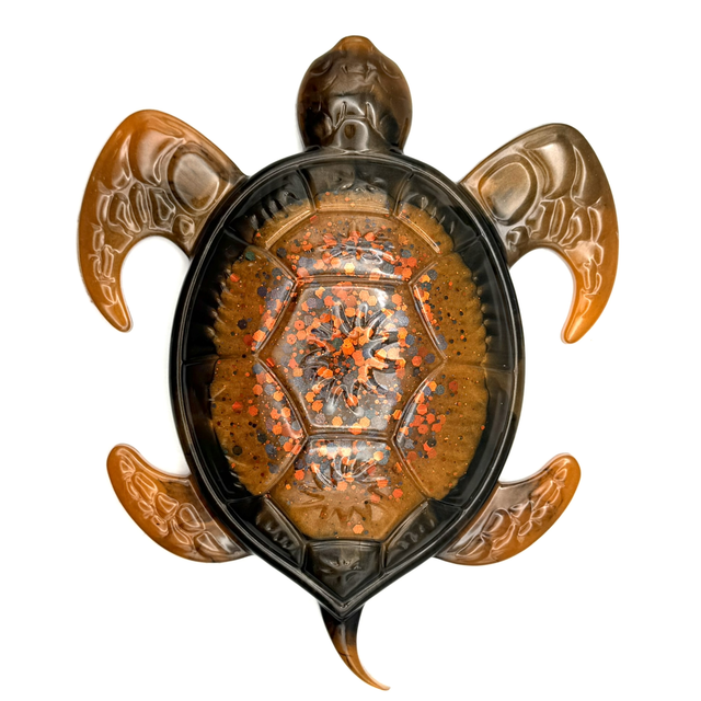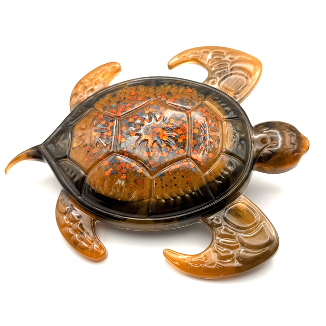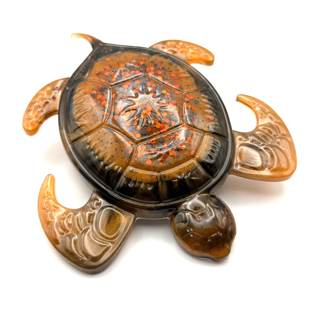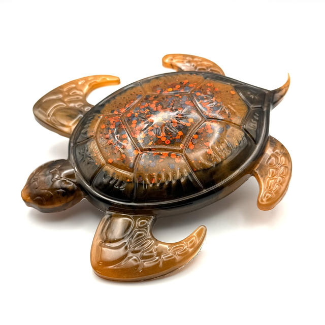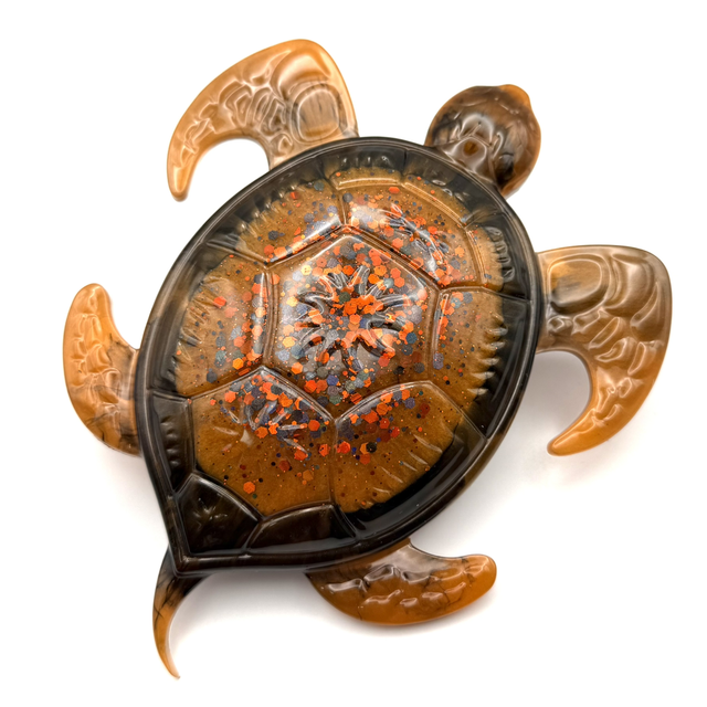 Laissez-vous envoûter par Néréide Ambrée, une création artisanale unique où la résine devient poésie. Née d’un mélange subtil de transparences et de pigments profonds, cette tortue semble figée dans un instant d’éternité, entre ombre et lumière.
